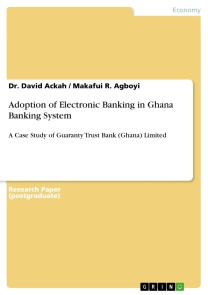 Research Paper (postgraduate) from the year 2014 in the subject Business economics - Banking, Stock Exchanges, Insurance, Accounting, grade: A, ( Atlantic International University ) (School of Business and Economics), course: Ph.D. Economics, language: English, abstract: Electronic banking (e-banking) has brought about a revolution in the functioning of banks as it offers major opportunities to banks and their customers. This has made the transition to electronic banking a necessity for banks in order to be viable. Despite its benefits, developing countries still lag behind in the adoption of electronic banking. This study therefore seeks to examine the adoption of e-banking in the Ghanaian banking industry with Guaranty Trust Bank Ghana Limited (GTBank) as the case study to identify the benefits, challenges and critical success factors for the adoption of e-banking in the Ghanaian banking industry. The research made use of questionnaires and interviews to collect data from staff and customers of GTBank. The results of the study indicated that e-banking adoption was a business strategy taken by the bank in response to customer needs and the changing marketing trends in the banking industry. The benefits, challenges and critical success factors of e-banking are also identified and discussed. From the study it is obvious that tremendous benefitssuch as revenue generation, improvement in productivity and efficiency in service delivery and cost savings were derived from e-banking. The lack of a solid technology infrastructure was identified as a major challenge of e-banking adoption in the country. The study however revealed that there is a promising future for e-banking in Ghana.Some recommendations to enhance the adoption of e banking in country are made based on this study.