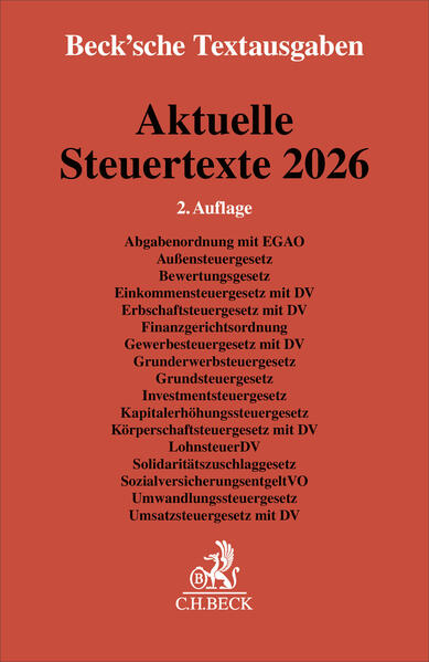 Abgabenordnung mit EGAO, Außensteuergesetz, Bewertungsgesetz, Einkommensteuergesetz mit DV, Erbschaftsteuergesetz mit DV, Finanzgerichtsordnung, Gewerbesteuergesetz mit DV, Grunderwerbsteuergesetz, Grundsteuergesetz, Investmentsteuergesetz,Kapitalerhöhungssteuergesetz, Körperschaftsteuergesetz mit DV, LohnsteuerDV, Solidaritätszuschlaggesetz, SozialversicherungsentgeltVO, Umwandlungssteuergesetz, Umsatzsteuergesetz mit DV. Textausgabe. Rechtsstand: 1. Februar 2026