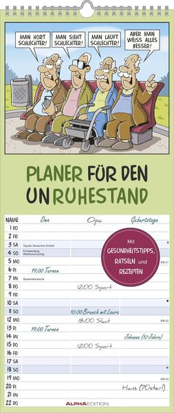 Der „Planer für den Unruhestand 2026“ von Alpha Edition ist der humorvolle Alltagsbegleiter für Senioren und Familien. Mit seinen bunten, witzigen Cartoons von Dirk Pietrzak bringt er Monat für Monat gute Laune an Ihre Wand – und sorgt gleichzeitig für Übersicht bei allen Terminen.