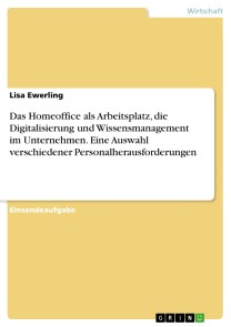 Lisa EwerlingEinsendeaufgabe aus dem Jahr 2020 im Fachbereich Führung und Personal - Sonstiges, Note: 1,7, SRH Fernhochschule, Sprache: Deutsch, Abstract: In dieser Einsendeaufgabe werden drei Herausforderungen für das Personal erläutert. Zum einen wird auf das Modell des Home-Office als Arbeitsplatz mit seinen Chancen und Herausforderungen kurz eingegangen. Zusätzlich wird auf die Digitalisierung und das Wissensmanagement eingegangen. Durch das Arbeiten im Home Office verändern sich die Anforderungen an Mitarbeiter, gegenüber der herkömmlichen Arbeitsform. Folgend werden die Veränderungen dargestellt. Ein wichtiges Kriterium, das virtuelle Arbeit voraussetzt, ist ein hoher Grad anSelbstständigkeit. Der Mitarbeiter muss von zu Hause aus selbstbestimmt und gut organisiert arbeiten. Vor allem muss geregelt sein, dass das private Leben von dem Beruflichen getrennt stattfindet. Bei Präsenztätigkeiten hat man bereits von Anfang an einen geregelten Arbeitsalltag, da man zuerst einen Arbeitsweg auf sich nimmt, um ungestört im Büro zu arbeiten. Zudem hat der Mitarbeiter meist feste Arbeitszeiten, zu diesen er sich im Büro befinden muss.