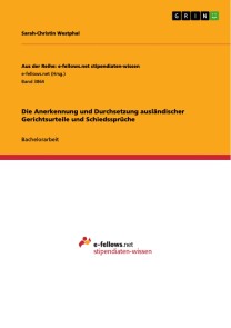 Bachelorarbeit aus dem Jahr 2018 im Fachbereich Jura - Zivilrecht / Handelsrecht, Gesellschaftsrecht, Kartellrecht, Wirtschaftsrecht, Universität Mannheim, Sprache: Deutsch, Abstract: Diese Arbeit beschäftigt sich zunächst mit den Problemen der Anerkennung und Durchsetzung ausländischer Gerichtsurteile und zeigt Möglichkeiten auf, wie die Vollstreckbarkeit solcher Urteile nicht nur auf den Urteilsstaat beschränkt bleiben muss und bewertet diese. Darüber hinaus diskutiert diese Arbeit die internationale Anerkennung und Vollstreckung von Schiedssprüchen und zeigt auch bezüglich dieses Themas bewertete Lösungsansätze auf. Denn Schiedsgerichte werden immer häufiger eingesetzt, um Streitigkeiten auf internationaler Ebene beizulegen. Belegbar ist dies beispielhaft am Rückgang der zivilrechtlichen Verfahren in Deutschland, obwohl der internationale Handel zunimmt. Die Neuzugänge zivilrechtlicher Verfahren sind seit dem Jahr 2004 um 37,48 % zurückgegangen. Bei Der Frage, warum Schiedssprüche international oft leichter anzuerkennen und durchzusetzen sind als ausländische Gerichtsurteile, wird ebenfalls nachgegangen. Dabei richtet sich die Arbeit exemplarisch nach deutschen Gesetzen und zeigt aber darüberhinaus auch Ähnlichkeiten zum deutschen Recht und Besonderheiten in den Rechtsordnungen anderer Staaten auf.