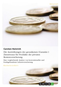 Carsten HeinrichBachelorarbeit aus dem Jahr 2013 im Fachbereich BWL - Bank, Börse, Versicherung, Note: 1,3, , Sprache: Deutsch, Abstract: Im Rahmen dieser Bachelorthesis werden die Auswirkungen des gesunkenen Zinsniveaus, hinsichtlich konventioneller und fondsgebundener Lebensversicherung, erläutert und mögliche Lösungen im Hinblick auf die Zukunft erarbeitet.Zu Beginn werden neben den aufsichtsrechtlichen Grundlagen auch die theoretischen Aspekte der konventionellen und fondsgebundenen Lebensversicherung dargestellt. Dabei geht der Autor im Speziellen auf die gemischte Lebensversicherung bzw. die private Rentenversicherung ein, da die reine Risikoabsicherung in Bezug auf die private Altersvorsorge eine nachrangige Rolle spielt. Im Bereich der aufsichtsrechtlichen Grundlagen werden neben der Geschichte und den Änderungen der letzten Jahrzehnte auch zukünftige Veränderungen im Hinblick auf Solvency I und II beschrieben. Die Beschreibung und detaillierte Erläuterung der Auswirkungen des sinkenden Zinsniveaus in Bezug auf die Lebensversicherungsunternehmen, Bestands- und Neukunden führen in den Praxisteil dieser Arbeit und verdeutlichen die Problematik für vorgenannte Institutionen bzw. Kundengruppen. Besonders hervorgehoben werden dabei die Auswirkungen auf die private Alters- bzw. Rentenvorsorge.Anschließend wirft der Verfasser dieser Arbeit einen Blick in die Zukunft und zeigt mögliche Szenarien im Falle eines anhaltend niedrigen Zinsniveaus für Lebensversicherungsunternehmen, Lebensversicherungsprodukte, Kunden und Versicherungsvermittler auf. Gerade im Hinblick auf die aktuellen Produktentwicklungen am Markt nimmt der Bereich der zukünftigen Lebensversicherungsprodukte eine wichtige Rolle ein. Im letzten Teil dieser Arbeit entwickelt der Verfasser verschiedene Lösungsansätze bzw. Kriterien um den unterschiedlichen Auswirkungen zu begegnen. Dabei werden vier verschiedene Kriterien hinsichtlich Ihrer Praktikabilität in Bezug auf Bestands- und Neukunden bewertet und abschließend tabellarisch dargestellt. Auch hierbei wird dem Bereich der Produktneuentwicklung besondere Wichtigkeit und Relevanz beigemessen, da sich im Laufe dieser Arbeit herausstellen wird, dass gerade dieser Punkt in erheblichem Maße Spielraum für die Zukunft bieten wird. Andere Bereiche dagegen lassen nur begrenzten Spielraum für Verbesserungen bzw. mögliche Lösungen.