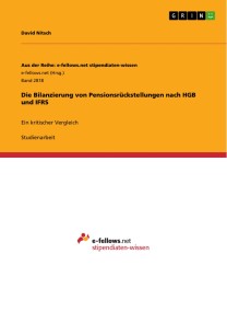 David NitschStudienarbeit aus dem Jahr 2018 im Fachbereich BWL - Rechnungswesen, Bilanzierung, Steuern, Note: 1,3, Hochschule für Technik und Wirtschaft Berlin, Sprache: Deutsch, Abstract: Pensionsrückstellungen zählen nicht nur zu den komplexesten Themen der Bilanzierung, sondern stellen in der Regel auch einen nicht unerheblichen Teil der Unternehmensbilanzen dar und sind deshalb im Fokus von Analysten und Investoren. Dabei unterscheidet sich das Vorgehen in der internationalen Rechnungslegung nach den IFRS deutlich von der Systematik der handelsrechtlichen Rechnungslegung. Somit ist eine vertiefte Kenntnis der Unterschiede zwischen HGB und IFRS zum Vergleich des Aussagegehalts von Jahresabschlüssen zwingend notwendig. Insbesondere im Bereich der unmittelbaren Pensionsverpflichtungen werden die Unterschiede zwischen diesen beiden Rechnungslegungsnormensystemen deutlich. Ziel dieser Arbeit ist eine vergleichende Gegenüberstellung der bilanziellen Abbildung von Pensionsrückstellungen nach HGB und IFRS. Es werden die wesentlichen Unterschiede in der Bilanzierungspraxis der beiden Rechnungslegungssysteme dargestellt und die sich eröffnenden Bewertungsspielräume kritisch analysiert.