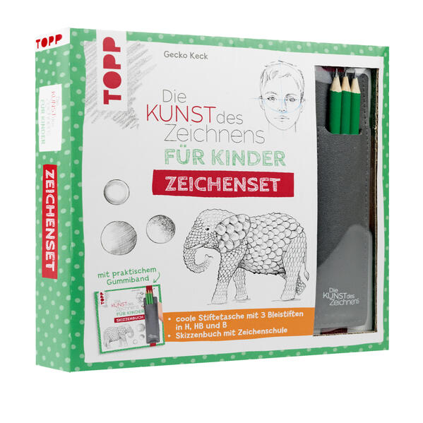 Kinder-Zeichenschule mit Skizzenseiten und cooler Stiftetasche mit 3 Bleistiften. Mit praktischem Gummiband