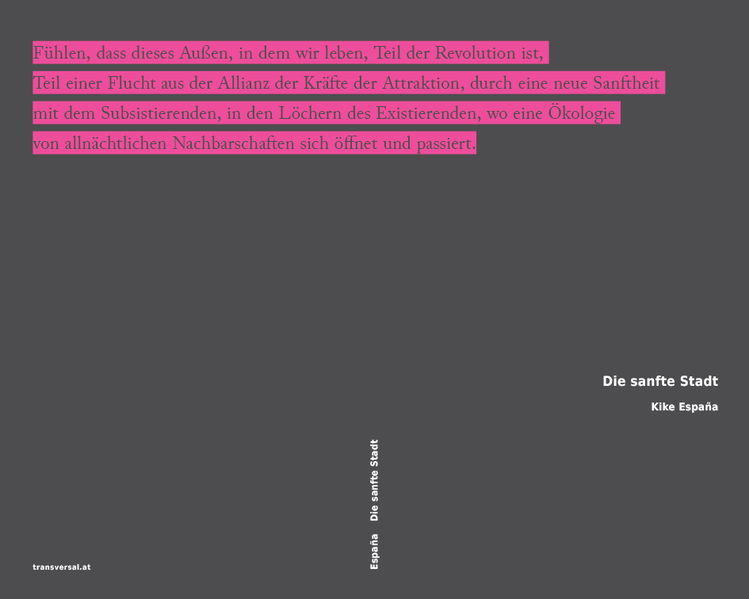 Die sanfte Stadt erscheint als exemplarische Schrift eines neuen aktivistischen Urbanismus, der nicht bei der kritischen Beleuchtung von Aufwertungsprozessen und auch nicht bei der Einforderung des Rechts auf Stadt stehen bleibt. Anhand der munizipalistischen Praxen der letzten zehn Jahre in der südspanischen Stadt Málaga entwickelt Kike España eine Theorie der subkommunalen Stadt, der Stadt gegen den Staat, der sanften Stadt. Undercommons, "Allnächtlichkeit" und die Attraktivität des scheinbar Unattraktiven sind Konzepte aus dem begrifflichen Werkzeugkasten von Fred Moten und Stefano Harney, die España aufnimmt und in einem intensiven Austausch mit den mikrosozialen Erfahrungen in und nach der 15M-Bewegung aktualisiert. Die Devise lautet, die Stadt zu durchlöchern, die Löcher unter und neben den kapitalistischen Verformungen von Tourismus und Gentrifizierung zu suchen und aufzusuchen, den urbanen Raum und die urbane Zeit zu löchern, sanfte Löcher zu produzieren, die eine radikale Reformulierung des Lebens in der Stadt mit sich bringen.