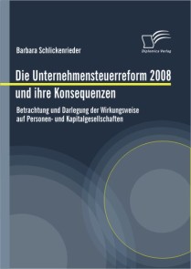 In dieser Studie werden magebliche Punkte des Reformpaketes zur Unternehmensbesteuerung 2008 vorgestellt und beurteilt. Vordergrundiges Ziel ist die die Wirkungsweise auf die verschiedenen Rechtsformen. Nachdem die Auswirkungen der letzten groen Steuerreform des Jahres 2000 kurz aufgezeigt werden, erfolgt eine Einordnung der zeitlichen Entstehung der Unternehmensteuerreform 2008. Grundintentionen, die zu Beginn des Gesetzgebungsverfahrens seitens der Regierung festgelegt wurden, werden aufgefhrt um am Ende der Studie einen Abgleich hinsichtlich der Zielerreichung vornehmen zu knnen. Die Studie beinhaltet die wichtigen nderungen, die Personengesellschaften betreffen. Der Schwerpunkt der Betrachtung liegt hierbei auf der vllig neuen Thesaurierungsbegnstigung. Auerdem beschftigt sie sich mit den mageblichen Reformpunkten, die auf Kapitalgesellschaften zukommen werden. Im Mittelpunkt stehen die Gesellschafterebene und die Darstellung der Fremdfinanzierung ber Gesellschafterdarlehen. Die wichtigsten Gegenfinanzierungsmanahmen werden vorgestellt und eingehend die Zinsschranke und deren Wirkungsweise erlutert. Im abschlieenden Teil erfolgt eine Zusammenfassung wichtiger Erkenntnisse. Weiterhin wird ein Abgleich hinsichtlich ursprnglicher Zielvorstellungen der Regierung und deren Umsetzbarkeit in die Praxis vorgenommen.