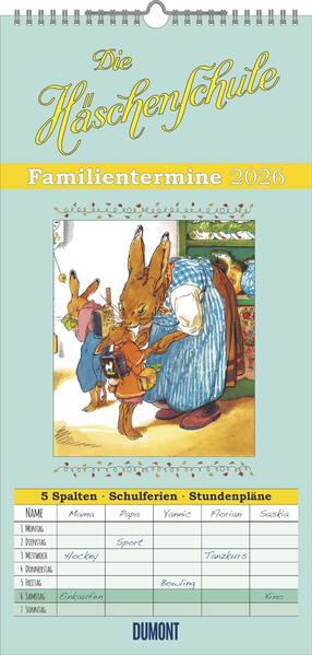 DUMONT - Familienplaner Häschenschule 2026 – Familienkalender 22x45 cm – Wandplaner mit 5 Spalten & Ferienterminen, nostalgische Illustrationen