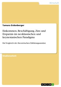 Studienarbeit aus dem Jahr 2016 im Fachbereich VWL - Makroökonomie, allgemein, Note: 1,0, Hochschule für Wirtschaft und Recht Berlin, Veranstaltung: Makroökonomie, Sprache: Deutsch, Abstract: In den letzten Jahrhunderten haben sich unterschiedliche Ansätze entwickelt, um die wirtschaftlichen Zusammenhänge einer Volkswirtschaft zu erklären. Zu den Populärsten zählen die Neoklassik und die Theorien von John Maynhard Keynes, der aus ihnen den Keynesianismus formte. Im Folgenden stelle ich die Kernaspekte der jeweiligen Theorien heraus, um zu analysieren, wovon Einkommen, Beschäftigung, Zins und Ersparnis beeinflusst werden und warum.Für die nachfolgenden Erklärungen und Grafiken habe ich mich auf die typischen Funktionsverläufe beschränkt. Demnach können die Theorien für speziellere Fälle auf anderen Annahmen beruhen und abweichende Verläufe hervorrufen, welche jedoch auf Grund ihres Umfangs nicht weiter behandelt werden und sich zudem nur im System einer geschlossenen Volkswirtschaft bewegen. Zur Vereinfachung wird von der Neoklassik oder dem neoklassischen Paradigma gesprochen, ohne dabei zusätzlich zu erwähnen, dass es sich dabei um die Sicht auf die makroökonomische Neoklassik handelt.