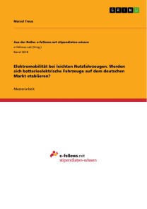 Marcel TreusMasterarbeit aus dem Jahr 2018 im Fachbereich Ingenieurwissenschaften - Wirtschaftsingenieurwesen, Note: 1,7, Fachhochschule Münster (ITB), Sprache: Deutsch, Abstract: Ziel der Arbeit ist es, die Forschungsfrage – ob sich batterieelektrische Fahrzeuge im deutschen Markt für leichte Nutzfahrzeuge etablieren werden – durch die Erarbeitung einer Prognose für die Marktentwicklung zu beantworten. Dazu wird zuerst der gesamte deutsche LNF-Markt hinsichtlich seiner aktuellen Situation, Haltergruppen und Trends untersucht, um dann eine Prognose für die Entwicklung des Marktes abzugeben. Anschließend wird das Thema Elektromobilität genauer betrachtet werden, in dem zuerst die vorhandenen Antriebskonzepte vorgestellt werden. Analog zum LNF-Markt werden dann die Marktsituation, Haltergruppen und Trends im Bereich der Elektromobilität aufgezeigt, sowie ein Ausblick auf die Marktentwicklung gegeben. Anschließend wird die Schnittmenge dieser beiden Märkte untersucht – die Elektromobilität bei leichten Nutzfahrzeugen – die den Kern dieser Arbeit darstellt. Auch hier wird wieder mit einem Einblick in die aktuelle Marktsituation gestartet, um dann die Haltergruppen ausführlich – insbesondere auf Basis ihrer Nutzungsmuster – zu analysieren und für jede Gruppe ein Potential für Elektromobilität abzuschätzen. Danach werden die möglichen Auswirkungen der aufgezeigten Trends auf die Elektromobilität bei LNF dargestellt. Mit diesen Informationen wird dann eine Prognose für die Marktentwicklung elektrischer LNF abgeben, um letztlich die Forschungsfrage zu beantworten. Zu guter Letzt wird dann noch eine kurze Zusammenfassung ein Ausblick gegeben.
