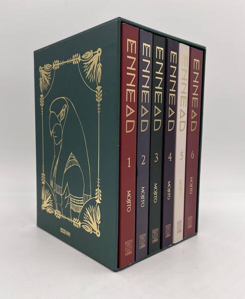Dieses Bundle besteht aus Band 1-6 im grünen Schuber und beinhaltet die komplette Story. Dieser faszinierende und mystische Webtoon entführt dich in eine Welt voller Magie und Intrigen. Ennead erzählt die Geschichte des ägyptischen Gottes Seth, der seinen Bruder Osiris tötet und Ägypten in eine Ära des Chaos und der Grausamkeit stürzt. Horus, der Sohn von Isis, erhebt sich, um Seth zu stürzen und Frieden zu bringen. Im Laufe der Zeit vermischen sich Hass, Besessenheit und Verlangen in ihrem Konflikt. Die alte ägyptische Mythologie wird in diesem fesselnden Fantasy-BL so lebendig, wie man sie noch nie gesehen haben. Für Fans von Fantasy-, Historien- und Romance-Webtoons und Manga! INHALT ¿ die komplette Story in 6 Bänden ¿ mit 6 Postkarten (18 x 13 cm) der originalen koreanischen Cover-Illustrationen in einem Umschlag ¿ grüner Schuber (21,8 x 15,5 x 13,5 cm; Gewicht befüllt: ung. 4,3 kg)
