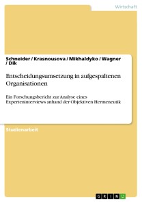 Studienarbeit aus dem Jahr 2010 im Fachbereich BWL - Unternehmensführung, Management, Organisation, Note: 1,3, Universität Kassel (Personalwirtschafts- und Organisationslehre), Veranstaltung: Qualitative Forschungsmethoden, Sprache: Deutsch, Abstract: Das Ziel der vorliegenden Arbeit leitet sich aus der übergeordneten Fragestellung ab. Um in Erfahrung zu bringen, wie Entscheidungen in einem aufgespaltenen Unternehmen umgesetzt werden, ist es zunächst notwendig zu klären, ob und vor allem wie sich die besondere Organisationsstruktur auf den Entscheidungsumsetzungsprozess auswirkt. Deswegen ist das Ziel der vorliegenden Arbeit zu ergründen, welche besonderen Eigenschaften einer aufgespaltenen Organisation auf Grundlage der Äußerungen des Interviewpartners entnommen werden können und vor allem, wie diese Eigenschaften auf den Entscheidungsumsetzungsprozess wirken. Die Analyse wird zeigen, dass die Diskrepanz zwischen der Aufbauorganisation und den Ablaufprozessen sich entscheidend auf den Entscheidungsumsetzungsprozess auswirkt. Mithilfe der Objektiven Hermeneutik als Analysemethode des Interviews wird die Hypothese gebildet und untermauert, dass die erwähnte Diskrepanz negativ den Entscheidungsumsetzungsprozess beeinflussen kann.Vorgehensweise:1. Forschungsobjekt2. Forschungsinteresse3. (Auswahl der Methode der Datenerhebung (wird vorgegeben))4. Interviewpartner und Interviewform5. Durchführung des Interviews6. Analyse des Informationsmaterials mit Hilfe der objektiven Hermeneutik7. Schlussfolgerungen1 AusgangsüberlegungenForschungsobjekt:Firma X ist ein innovativer Anbieter von Lösungen, Produkten und Dienstleistungen im Bereich der Sicherheitssysteme und bildet einen wichtigen Bereich von Produkten und Dienstleistungen der X - Gruppe, die in mehr als 40 Ländern präsent ist.Firma X ist mit verschiedenen Standorten in Deutschland vertreten, wobei die Geschäftsleitung ihren Sitz in Stadt Y hat. Die Vertriebszentrale der Sicherheits-, Kommunikationsprodukte und -systeme für die Länder Deutschland, Österreich und Schweiz befindet sich am Standort Kassel.Die Organisationsstruktur des Unternehmens erscheint, sehr komplex und unübersichtlich zu sein, was auch vermuten lässt, dass die Entscheidungsfindungs- und Entscheidungsumsetzungsprozesse (unter Umständen) nicht reibungslos ablaufen.Forschungsinteresse:Wie werden die Entscheidungen in einer aufgespaltenen Organisation umgesetzt?Interviewpartner:Interviewt wurde der Vertriebsleiter der Firma X in Kassel. Er arbeitet seit Kurzem mit einem neuen Vorgesetzten (Geschäftsleiter in Stadt Y).