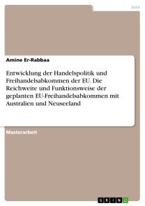 Amine Er-RabbaaMasterarbeit aus dem Jahr 2022 im Fachbereich Jura - Europarecht, Völkerrecht, Internationales Privatrecht, Note: 2.0, Gottfried Wilhelm Leibniz Universität Hannover (Juristische Fakultät), Sprache: Deutsch, Abstract: Die Europäische Union (EU) ist eine der wichtigsten Handelsblöcke der Welt. Sie hat mit über 70 Ländern Freihandelsabkommen (FTAs) abgeschlossen, darunter mit Australien und Neuseeland. Diese Abkommen sollen den Handel zwischen den EU-Mitgliedstaaten und den Partnerländern fördern und neue wirtschaftliche Möglichkeiten schaffen.Die vorliegende Arbeit untersucht die Entwicklung der Handelspolitik der EU und die Reichweite und Funktionsweise der geplanten FTAs mit Australien und Neuseeland. Im ersten Kapitel wird die EU-Handelspolitik im Kontext der globalen Handelsordnung dargestellt. Im zweiten Kapitel wird erörtert, ob FTAs als gemischte Abkommen oder als EU-only-Abkommen zu schließen sind. Das dritte Kapitel befasst sich mit dem Hintergrund, den Zielen und den zentralen Regelungsbereichen des FTAs mit Australien. Das vierte Kapitel behandelt dieselben Aspekte des FTAs mit Neuseeland. Das fünfte Kapitel bewertet die potenziellen Auswirkungen der FTAs auf die Fortentwicklung der Beziehungen der EU mit Australien und Neuseeland.