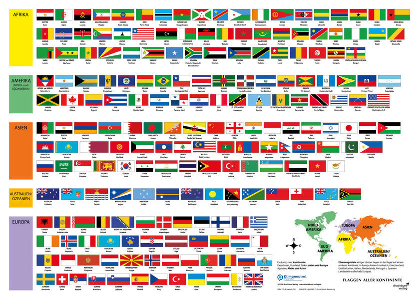 Südafrika hat gleich drei Hauptstädte, (Pretoria, Kapstadt, Bloemfontein) andere Länder wunderbare Namen und prächtige Flaggen. Wie diese aussehen erfahrt ihr auf unserem neuen Flaggenposter der Welt. So viele Farben, Staaten und Städte! Wer weiß die Hauptstadt von Senegal? (Dakar) oder kann Astana zuordnen? (Kasachstan). Auf welchen Kontinenten findet ihr Ägypten (Afrika) oder Jamaika? (Amerika) Was meint ihr? Wer kann so richtig punkten? Das neue Flaggenposter Welt ist nicht nur schön bunt, sondern unterhält, vermittelt Wissen und sieht wunderschön aus. Allen kleinen und großen Weltenbummlern, Leseratten und Schlaufüchsen viel Spaß damit!