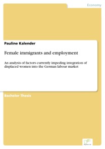 Pauline KalenderBecause of the high number of involuntary migrants who arrived in Germany over the past years, displaced people may at least partly counteract the economic consequences of the demographic change in Germany. Yet, particularly displaced women are comparatively seldom employed in Germany. The purpose of this thesis therefore is to identify factors that impede the inclusion of displaced women into the German labour market and examine their respective importance. The employment of these women has, amongst others, positive effects on their social integration, the federal budget and the German economy. In this thesis, a theoretical analysis of relevant literature concerning the topics migration, gender equality, employment and impediments for labour market integration of displaced women is given. Afterwards, two surveys are presented. The first survey is a quantitative one analysing the data of 42 displaced women. The second one is qualitative, gathering information from five experts. Main impediments for integration of displaced women into the labour market are the lack of professional experience and education, particularly poor German skills. Other major difficulties are traditional role distribution and bias by employers, especially against women wearing headscarves. The results provide a basis for the creation or alteration of support offers that facilitate labour market participation for displaced women.