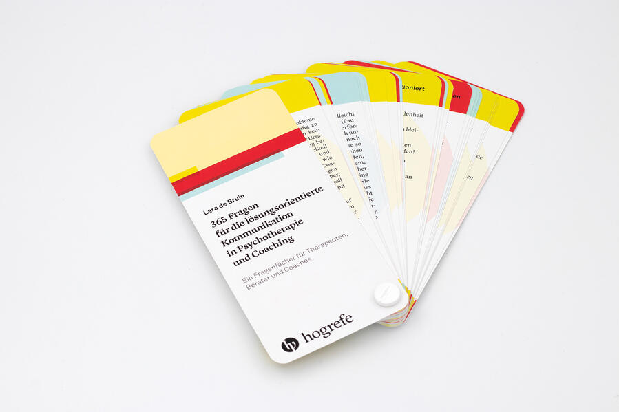 Wer ständig gedanklich um seine Probleme kreist, findet damit nicht zwangsläufig zu praktikablen Lösungen. Psychotherapeuten, Berater und Coaches, die lösungsorientiert arbeiten, fragen daher ihre Klienten lieber, wie ihre erwünschte Zukunft aussehen soll und ob sie Zeiten erleben, in denen es bereits gut läuft und das Problem nicht auftritt. Die 365 Fragen des Fragenfächers unterstützen Psychotherapeuten, Berater und Coaches bei der lösungsorientierten Gesprächsführung. Der Fächer dient als Hilfsmittel, um ein Gespür für die Fragetechniken und den Aufbau der Gespräche zu bekommen. Die Einteilung des Fragenfächers ermöglicht ein schnelles Auffinden der passenden Fragen für spezifische Situationen, für die Klienten Lösungen suchen (z.B. Umgang mit schwierigen Situationen, Erfolge analysieren, Angst, Streit und Konflikt, Selbstwert stärken). Die Fragen sind bewusst so formuliert, dass sie implizit immer die Annahme, die Dinge werden wieder besser laufen, mittransportieren. Ziel ist es, die Fähigkeit von Klienten, selbst Lösungen für ihre Probleme zu finden, zu aktivieren.