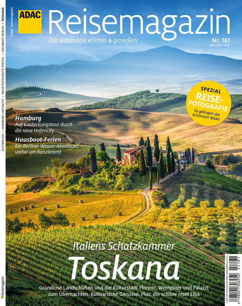 Toskana Sanfte Weinhügel und faszinierende Kulturstädte wie Florenz und Siena; das azurblaue Meer, kulinarische Genüsse sowie historische Palazzi und Rebgüter zum Übernachten: Die sonnige Toskana ist Italiens Schatzkammer und das große Titelthema der aktuellen Ausgabe des ADAC REISEMAGAZINS. Außerdem im Heft: ein informatives Spezial zur „Reisefotografie", Hausbooturlaub sowie Hamburgs neue Hafencity.