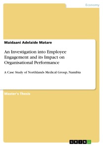 Master's Thesis from the year 2019 in the subject Business economics - Business Management, Corporate Governance, grade: 0,74, , course: Master of Business Administration, language: English, abstract: The aim of this research was to evaluate employee engagement within Northlands Medical Group, Namibia and its potential impact on organisational performance. The company management made a realisation that there was a dearth of robust information regarding employees’ engagement levels, as well as their intentions to quit or stay, and factors influencing these. This was a quantitative survey study and a structured questionnaire was used to ascertain the factors affecting employee engagement. The survey was conducted telephonically to a study population of 80 respondents. The study population was randomly selected from the company database of all the employees.Employee performance and the nature of interaction with customers are critical in the service industry such as the health care industry. Employee engagement, a contemporary concept linked to employee job satisfaction and motivation, has been well recognised in the literature as being sturdily correlated with their performance, presentism, and advocacy and retention intentions. Therefore, organisations need to empirically and robustly measure employee engagement amongst their staff complement, and determine factors that may influence it, so as to take evidence-based remedial action.Findings from primary research pertaining to the factors affecting engagement levels of the employees at Northlands Medical Group revealed that there were 3 main factors that affect employee engagement namely emotional, cognitive/mental and physical energy factors. The majority of the Northlands Medical Group employees have been found to be actively engaged in all the three major factors that affect engagement. In relation to describing the relationship between employee engagement and organisational performance, findings revealed that there is a very strong connection between employee engagement and organisational performance. The primary research findings revealed that the majority of the Northlands Medical group employees were fully committed to their job, the organisation and they have great advocacy for the company to potential employees and clients. This could be a sign of active engagement and in turn, organisational performance thrives from that.