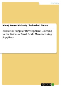 Document from the year 2019 in the subject Business economics - Industrial Management, , language: English, abstract: The strength of the supply chain largely depends upon the strength of the associated suppliers to the organization. Development of the associates is a direct method to improve original equipment manufacturers or buying organizations’ development. Supplier development is associated with many desirable outcomes like cost reduction, time to market, reduced cycle time, improved quality of the product, manufacturing flexibility and knowledge exchange between business partners. Manufacturing sector plays a vital role in the economy of every country for value creation, contribution to the GDP, boosts foreign exchange reserves, employment generation and poverty reduction. This calls for a special focus on manufacturing sector and so as on manufacturing outsourcing value chain. The role of small scale suppliers (SSI) are substantial in providing the competitive edge to the manufacturing organizations. So it is advisable to keep the SSI suppliers’ growth, development and satisfaction high in order to meet the desired operational flexibility, competitive advantage, time to market, increased market share and improved profit by the large scale organizations. Lot of research activities carried out in reference to the supplier development (SD) from buying firm’s perspective. Supplier development models, theoretical frameworks, barriers of SD explored only from the buying organizations view point. Very little research carried out on SD from selling organization point of view and that too in discrete manufacturing sector, it is not witnessed even one. This book is trying to explore the attributes which are affecting directly or indirectly the development of small scale manufacturing sectors to support the overall value chain.