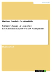 Studienarbeit aus dem Jahr 2009 im Fachbereich BWL - Unternehmensführung, Management, Organisation, Hochschule für Technik und Wirtschaft Chur, Veranstaltung: Corporate Social Responsibility, Sprache: Deutsch, Abstract: The following memorandum is written to provide the UEFA with social responsibility suggestions concerning the environment. Climate change is having a direct impact on UEFA’s activities in the future as its organizing activities are outdoor and increasingly affected by droughts and floods and further effects of climate change. UEFA is also one of Europe’s institution having one of the greatest travel expenses each year and is thus also contributing to a great extend to climate change on its own and is therefore suggested to provide an offsetting return to the environment. Furthermore, the urgency and impact of climate change deteriorates with almost every newly released environmental report and the world requires pioneers to take a leading role in fighting this problem. UEFA has greatest influence on people’s behavior in and outside Europe and can therefore positively influence this behavior by setting an example. This will make people also act environmentally conscious and ultimately strengthen to make the way for football to continue to flourish in the long-term future. The memorandum will be divided up into five sections. First, some background information on the problem will be provided before issues arising from the problem will be discussed. The third section will state several options to tackle the problem while the fourth section identifies the stakeholders and their stakes in the problem. The final section will provide UEFA with clear recommendations about what climate change programs to undertake and when to undertake them all based on the analysis of the previous sections. [...]