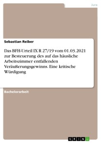 Bachelorarbeit aus dem Jahr 2022 im Fachbereich Jura - Steuerrecht, Note: 1,3, Johannes Gutenberg-Universität Mainz, Sprache: Deutsch, Abstract: Die kritische Würdigung des betreffenden BFH-Urteils IX R 27/19 vom 01.03.2021 zur Besteuerung des auf das häusliche Arbeitszimmer entfallenden Veräußerungsgewinns ist das Ziel dieser Arbeit.Dazu erfolgt in Kapitel 2 zunächst eine Darstellung des zugrunde liegenden Sachverhaltes und der Urteile beider Instanzen, während in Kapitel 3 näher auf den Typusbegriff des häuslichen Arbeitszimmers eingegangen wird. Anschließend wird in Kapitel 4 die Kernfrage dieser Arbeit erörtert, wie der auf das häusliche Arbeitszimmer entfallende Gewinn aus der Veräußerung von Wohneigentum zu besteuern ist. Entscheidend ist dabei insbesondere das Kriterium „Nutzung zu eigenen Wohnzwecken“ in Kapitel 4.2. und die mögliche Beurteilung des Arbeitszimmers als eigenständiges Wirtschaftsgut in Kapitel 4.3. Zum Schluss der Arbeit werden in Kapitel 5 die gewonnenen Erkenntnisse thesenförmig zusammengefasst.