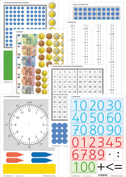 Dem Mathebuch 2 liegen stabile kartonierte Arbeitsbeilagen bei: . Zahlenkarten . Hundertertafel, Hunderterfeld und Wendeplättchen . Hunderterpunktefeld/Tangram/Spielgeld . Lernuhr/Einheitsquadrate . Zahlenstrahl . Spielgeld . Zehner- und Fünferstreifen