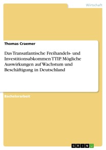 Bachelorarbeit aus dem Jahr 2015 im Fachbereich VWL - Außenhandelstheorie, Außenhandelspolitik, Note: 1,7, Rheinische Friedrich-Wilhelms-Universität Bonn (Institute for International Economic Policy), Sprache: Deutsch, Abstract: Seit Juli 2013 verhandeln die USA und die EU die Schaffung eines Freihandels- und Investitionsschutzabkommens im Rahmen der Transatlantic Trade and Investment Partnership (TTIP). Zielsetzungen der Verhandlungspartner sind die Verbesserung des gegenseitigen Marktzugangs, Bürokratieabbau und die regulatorische Zusammenarbeit (Europäische Kommission, 2015). Die im April 2015 ausgedehnte Anzahl der Verhandlungsrunden sowie der breite öffentliche Diskurs umfassen eine Vielzahl von Themengebieten, die im Zusammen- hang mit TTIP zu diskutieren sind. Zentrale Felder bilden dabei die wirtschaftlichen Auswirkungen einer Liberalisierung, der Verbraucherschutz, Umweltstandards und der Investitionsschutz. Diese Arbeit befasst sich ausschließlich mit den möglichen Wirkungen von TTIP auf Wachstum und Beschäftigung in Deutschland und betrachtet dabei keine Wechselwirkungen mit Ländern außerhalb des Freihandelsraums.Exakte Vorhersagen sind insgesamt nicht möglich, da diese stark von der konkreten Umsetzung des Abkommens abhängen. Diese Arbeit soll einen ersten Beitrag dazu leisten, elementare Wirkungskanäle von TTIP auf die deutsche Produktion und Beschäftigung zu verstehen, um dadurch eine Beurteilung aktuell bedeutender Studien zu ermöglichen.