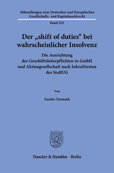'The Shift of Duties in the Event of Likely Insolvency. The Focus of Directors' Duties in GmbH and Aktiengesellschaft following the Enactment of the StaRUG': This paper examines the duties of directors of corporations (GmbH and Aktiengesellschaft) following the enactment of the German Act on the Stabilization and Restructuring Framework for Companies (StaRUG). The focus lies on the question of whether and to what extent the directors are obliged to act in the interests of creditors instead of shareholders if the company is likely to become insolvent (shift of duties).