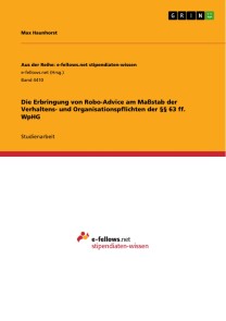 Studienarbeit aus dem Jahr 2021 im Fachbereich Jura - Zivilrecht / Handelsrecht, Gesellschaftsrecht, Kartellrecht, Wirtschaftsrecht, Note: 15,0, Universität Osnabrück (Institut für Unternehmens- und Wirtschaftsrecht), Sprache: Deutsch, Abstract: Robo-Advice stellt eine Form der durch einen Algorithmus unterstützten Anlageberatung dar. Dadurch können insbesondere privaten Anlegern eine kostengünstige und schnelle Anlageberatung ermöglicht werden.Allerdings gehen mit dieser Form der KI-gestützten Anlageberatung auch erhebliche Risiken für die Anleger einher. In dieser Seminararbeit wird thematisiert, inwiefern die bestehenden Schutzvorschriften der §§ 63 ff. WpHG auf die unterschiedlichen Formen des Robo-Advice anwendbar sind. Daraus ergibt sich eine weitergehende Regelungsbedürftigkeit für diese neue Form der Anlageberatung.