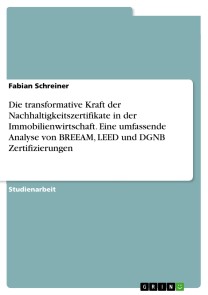 Studienarbeit aus dem Jahr 2023 im Fachbereich BWL - Marktforschung, Note: 1,3, Hochschule Fresenius München (Wirtschaft und Medien), Sprache: Deutsch, Abstract: Entdecken Sie die transformative Kraft der Nachhaltigkeitszertifikate in der Immobilienwirtschaft. Diese umfassende Analyse deckt den gesamten Lebenszyklus von Immobilien ab – von der Planung über den Bau bis hin zur Nutzung und letztendlichen Veräußerung – und zeigt auf, wie Nachhaltigkeitszertifikate Effizienz steigern, den Wert von Immobilien erhöhen und einen entscheidenden Beitrag zur ökologischen Nachhaltigkeit leisten. Durch den Vergleich zwischen traditionellen Bauweisen und nachhaltig zertifizierten Gebäuden bietet die Arbeit tiefe Einblicke in die Bedeutung und den Einfluss von BREEAM, LEED und DGNB Zertifizierungen auf die Immobilienbranche.Mit konkreten Praxisbeispielen illustriert und kritisch hinterfragt, adressiert die Publikation sowohl die wirtschaftlichen als auch die ökologischen Vorteile nachhaltiger Bauweisen und legt die Herausforderungen, politischen Rahmenbedingungen und Marktmechanismen offen, die mit der Implementierung von Nachhaltigkeitsstandards in der Immobilienwirtschaft einhergehen. Ob Sie ein Branchenexperte sind oder einfach ein Interesse an der nachhaltigen Entwicklung der Immobilienbranche haben, dieses Werk liefert eine grundlegende Perspektive auf die Rolle und den Einfluss von Nachhaltigkeitszertifikaten, umreißt die aktuellen Trends und gibt einen Ausblick auf die Zukunft des nachhaltigen Bauens und Wirtschaftens im Immobiliensektor.