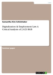 Seminar paper from the year 2020 in the subject Law - Civil / Private, Trade, Anti Trust Law, Business Law, grade: 1,0, University of applied sciences Frankfurt a. M., language: English, abstract: In this paper, the article § 623 BGB will be critically analysed, because the article regulates the formal requirements of terminations and separation agreements. To gain a general overview the touched paragraphs of the German Civil Code, shortened to BGB, will be included in the assignment in the original language and the latest translation into English.Due to the current situation, the worldwide corona pandemic, the world of work is becoming increasingly unbounded. Employers and employees gradually see the advantages of home office and “New Work”. The pandemic forced companies and employees to organize their new work environment quick, which sometimes ended up in a disorganized and chaotic way. If new forms of work are implemented in a planned manner in the future, all sides can benefit even more. The crisis, in general, holds plenty of opportunities to set a new course for the future of work. On the long run authorities will have to support the upcoming requirements of employees and employers with adjusted rules and regulations. An essential part of the employment cycle for employees and employers are terminations and sometimes even separation agreements.