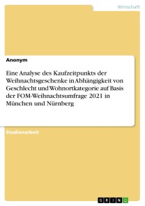 Studienarbeit aus dem Jahr 2024 im Fachbereich VWL - Statistik und Methoden, Note: 1,0, FOM Hochschule für Oekonomie und Management gemeinnützige GmbH, Hochschulstudienzentrum Hamburg, Veranstaltung: Quantitative Methoden, Sprache: Deutsch, Abstract: Die Seminararbeit "Eine Analyse des Kaufzeitpunkts der Weihnachtsgeschenke in Abhängigkeit von Geschlecht und Wohnortkategorie" untersucht anhand der FOM-Weihnachtsumfrage 2021 das Kaufverhalten in München und Nürnberg. Mittels quantitativer Datenanalyse werden geschlechtsspezifische und regionale Unterschiede im Kaufverhalten aufgezeigt.