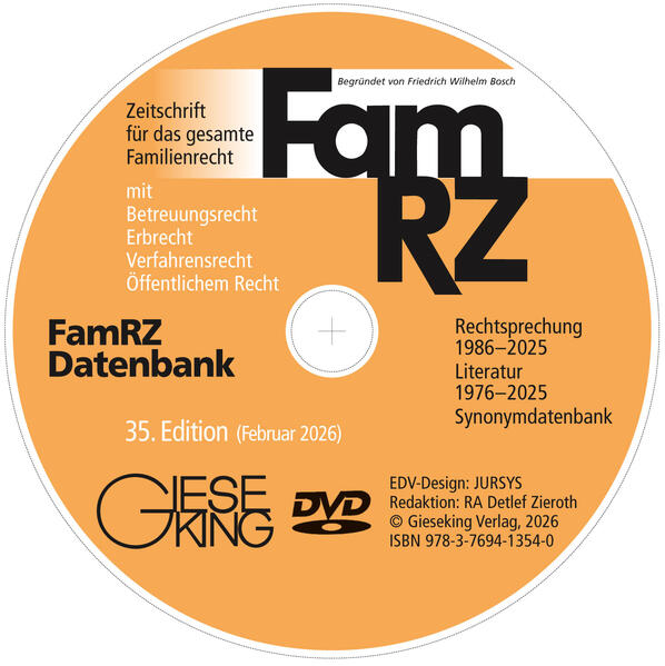 Die FamRZ Datenbank ist die authentische Datenbank zur FamRZ, der Zeitschrift für das gesamte Familienrecht mit Betreuungsrecht, Erbrecht, Verfahrensrecht, öffentlichem Recht - also das Original auf DVD. Ihre Vorteile auf einen Blick:\n\n- Volltext der letzten 39 Jahrgänge\n- eingehende Verschlagwortung\n- Synonymdatenbank\n- komfortable Suchfunktionen\n- offline\n- unabhängig vom Internet und Netzkapazitäten\n- stets und nachhaltig verfügbar\n- technisch sicher.