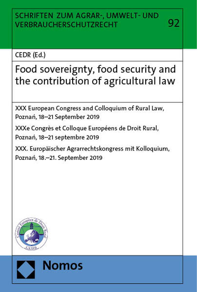 Roland Norer<p>Vom 18. bis 21. September 2019 fand der XXX. Europäische Agrarrechtskongresses des C.E.D.R in Poznań statt. Das übergreifende Thema des Kongresses war „Ernährungssouveränität, Ernährungssicherheit und der Beitrag des Agrarrechts". Die wissenschaftliche Arbeit wurde in drei getrennten Kommissionen entwickelt. Das Kolloquium widmete sich der kommenden Reform der Gemeinsamen Agrarpolitik. Dieser Band enthält die im Rahmen des Kongresses von den drei Kommissionen erarbeiteten Generalberichte und deren Schlussfolgerungen, eine Darstellung des Kolloquiums sowie einen Synthesebericht. <b>Mit Beiträgen von</b>Dr. hab. Paweł A. Blajer | Prof. Dr. hab. Roman Budzinowski | Dr. Christian Busse | Prof. em. Margaret Rosso Grossman | Prof. Dr. hab. Aleksander Lichorowicz | Prof. Dr. Rudolf Mögele | Prof. Dr hab. Ryszard Naskręcki | Prof. Dr. Roland Norer | Dr. Ludivine Petetin | Jerzy Plewa | Ass.-Prof. Dr. Anikó Raisz | Prof. Dr. Jeroen Rheinfeld | Prof. em. Dr. Paul Richli | Ass.-Prof. Dr. Luigi Russo | Geoff Whittaker</p>