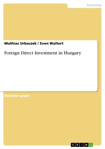 Seminar paper from the year 2005 in the subject Economics - Foreign Trade Theory, Trade Policy, grade: 2,0, Cracow University of Economics, language: English, abstract: PrefaceFor Hungary and the European Union, the 01. May 2004 is one of the most important dates of the history of Hungary, because they and 9 other countries joined the EU. Finally now the very long time of the separation between Eastern and Western Europe is over. It is now the first time in Europe that all countries of this big continent could life together in peace and can create an economical and political union.For Hungary it was like for the other new members a very long and hard way to transform the economy to the rules of the market economic system, but they have some advantages because they have started the reform process already before the political change. So as a reason now Hungary has received 31 billion euros as foreign direct investment until 2003. This means they have about 3.100 Euro FDI per inhabitant, only the Czech Republic has received more FDI per inhabitant.In the assay the authors want to concentrate to the historical background, the business law, the motivation for invest in Hungary and give some data about the FDI in Hungary.