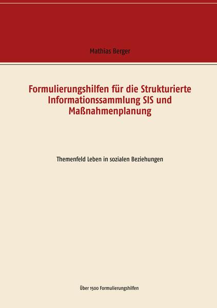 Mit diesem Buch erhalten Sie über 1500 Formulierungshilfen für die Erstellung einer Strukturierten Informationssammlung SIS im Themenfeld Leben in sozialen Beziehungen sowie für die Erstellung einer Maßnahmenplanung. Die Formulierungshilfen gliedern sich in Risiken und Probleme sowie in Fähigkeiten, Wünsche und Bedürfnisse. Außerdem sind die Formulierungshilfen für die Erstellung der Strukturierten Informationssammlung in Kategorien unterteilt, wie zum Beispiel: Beziehungen, Rollenverhalten, Erscheinungsbild, Integration u.v.m. Im Anschluss finden Sie eine große Anzahl an Formulierungshilfen für die Maßnahmenplanung in diesem Themenfeld. Neben diesem Buch erhalten Sie weitere Bücher mit Formulierungshilfen zur SIS und Maßnahmenplanung für andere Themenfelder wie Kommunikation und Kognition, Mobilität und Beweglichkeit, krankheitsbezogene Anforderungen und Belastungen, Selbstversorgung und Haushaltsführung bzw. Häuslichkeit und Wohnen.