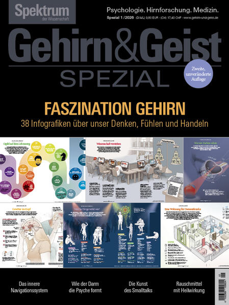 Immer wieder stehen wir in der Redaktionskonferenz vor der Frage, in welcher Textform wir ein Thema präsentieren: als Interview, als kurze News oder als langen Hintergrundartikel? Gerade komplexe Zusammenhänge lassen sich aber oft am besten mit Hilfe von Grafiken erklären. Und so kam es, dass wir 2013 entschieden, in 'Gehirn&Geist' regelmäßig Phänomene rund um Psychologie, Hirnforschung und Medizin in Form großer Infografiken darzustellen. Mit den Jahren hat sich ein ordentlicher Fundus angesammelt, von dem wir nun schon zum zwei¬ten Mal ein 'Best-of' präsentieren. Wie funktioniert unser Orientierungssinn? Was haben Darmbak¬terien mit der Psyche zu tun? Und warum lassen wir uns im Supermarkt so leicht zu Spontankäufen animieren? Antworten darauf und auf viele weitere Fragen über unser Denken, Fühlen und Handeln finden Sie in dieser Spezialausgabe von 'Gehirn&Geist'. Jede der 38 Grafiken im Heft widmet sich einem eigenen Thema. Einige von ihnen haben wir aktualisiert, etwa jene über das medizinische Potenzial von Cannabis, LSD und Co. ('Rauschmittel mit Heilwirkung'). Denn in letzter Zeit hat sich hier so manches an der Rechtslage getan. Lehnen Sie sich zurück und blättern Sie gerne kreuz und quer durch die Ausgabe! Dann werden Sie sicherlich immer wieder auf Darstellungen stoßen, die Ihnen völlig neue Erkenntnisse vermitteln - oder einen frischen Blick auf Altbekanntes. Viel Spaß beim Stöbern wünscht Ihre Anna von Hopffgarten