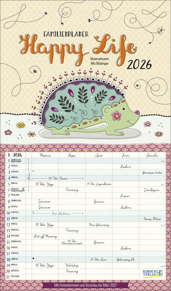 Der Familienplaner "Happy Life" kommt luftig-leicht daher und sorgt für ein positives Lebensgefühl mitten im Alltagsstress. Bei den fröhlichen Illustrationen von Mo Büdinger dominieren pastellige Farbtöne, kombiniert mit eigens kreierten Mustern sowie - ganz im Trend - mit handgeschriebenen Monatsnamen. Mit fünf Spalten zum Planen behalten alle den Überblick. Eine zusätzliche Müllspalte sowie Ferientermine und Vorschau bis März des Folgejahres runden diesen liebenswerten Familienplaner ab.