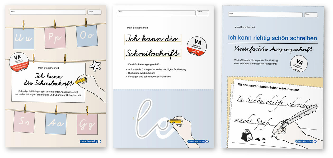 Meine Sternchenhefte 1. Ich kann die Schreibschrift - Schreiblehrgang Der Schreibschriftlehrgang in Vereinfachter Ausgangsschrift dient der selbstständigen Erarbeitung und Übung der Schreibschrift. Jetzt mit 4 weiteren Übungsseiten. 74 Seiten DIN A4 - ISBN 978-3-939293-25-5 2. Ich kann die Schreibschrift - Übungsheft zu den Buchstabenverbindungen - Vereinfachte Ausgangsschrift - Aufbauende Übungen zur selbstständigen Erarbeitung - Buchstabenverbindungen - Flüssiges und schwungvolles Schreiben üben 46 Seiten DIN A4 - ISBN 978-3910429-71-0 3. Ich kann richtig schön schreiben - Übungsheft zur Schreibschrift Liebe Schülerin, lieber Schüler, in diesem Heft sollst du üben schön zu schreiben und dir besonders viel Mühe mit deiner Handschrift geben. Besonders im unteren Teil der Seiten übst du deine eigene Handschrift. Du kannst den unteren Teil gestalten, heraustrennen, jemandem zeigen oder schenken, aufhängen, einrahmen oder einfach auch im Heft lassen. Du hast auch die Möglichkeit alle oder einzelne Blätter an der linken Seite neu zu heften. Dann hast du ein neues Heftchen mit Themen, die dir besonders gefallen haben und die du schön gestaltet hast. 34 Seiten DIN A4 - ISBN: 978-3-946904-26-7