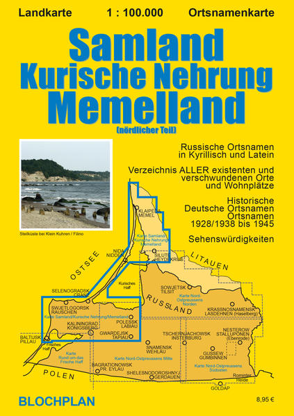 Die Karte zeigt im detaillierten Maßstab 1:100.000 einerseits das historische Samland - den Bereich zwischen Königsberg/Kaliningrad, Cranz/Selenogradsk, Pillau/Baltijsk und Labiau/Polessk - eine Landschaft die von der Ostseeküste mit ihren Steilhängen und Schluchten, den Bernsteinfeldern bei Palmnicken/Jantarnij, der malerischen Küste des Kurischen Haffs und den Häfen entlang des Königsberger Seekanals genau so wie von ihrem lieblichen Binnenland mit dem Alkgebirge und den kleinen Seen und Teichen geprägt ist. Auf der anderen Kartenseite ist der heute zu Litauen gehörende nördliche Teil des früheren Memellandes von Heydekrug/Šilut¿ über die Stadt Memel/Klaip¿da bis zum größten litauischen Ostseebadeort Palanga gleich neben Nimmersatt/Nemirseta (dem einstmals nördlichsten Dorf des Deutschen Reiches) dargestellt. Verbindendes Glied zwischen beiden Karten ist der 100 km lange und maximal 4 km breite Streifen der Kurischen Nehrung, der heute jeweils hälftig zu Russland und zu Litauen gehört. Das Samland und die Kurische Nehrung zählen heute zu den schönsten und für Besucher interessantesten Gegenden Nord-Ostpreußens und jeder, der Kaliningrad/Königsberg besucht, sollte auch einen Ausflug an die samländische Ostseeküste oder auf die Nehrung mit ihren einmaligen Dünenlandschaften einplanen. Der bekannteste Ort der Nehrung ist Nidden, in dem Thomas Manns Sommerhaus heute als Museum und Künstlertreffpunkt einlädt. Am Nordende der Nehrung wartet die lebendige Stadt Memel/Klaip¿da mit vielen historischen Gebäuden, einer liebevoll sanierten Altstadt und ihrem Ännchen-von Tharau-Denkmal auf Besucher aus nah und fern. Außerdem enthält die Karte Hinweise auf besondere Sehenswürdigkeiten wie z. B. die Ordensburgen in Schaaken, Waldau, Tapiau oder Labiau, die Ruinen der Schlösser Grünhoff, Lochstädt, Friedrichstein oder Kaymen, die Kirchen in Neuhausen oder Arnau, das St.-Adalbert-Kreuz in Tankittino, dem früheren Tenkitten, eine Vielzahl von ethnografischen Museen in historischen Bauernanwesen des Memellandes, das gesamte Stadtgebiet Königsbergs mit allen Vororten und vieles mehr. Zur zusätzlichen Orientierung sind neben den Straßen und nur zum Teil befahrbaren Wegen, die aktuellen aber auch die stillgelegten Eisenbahnstrecken und die Kreisgrenzen von 1937 dargestellt. Die Karte enthält alle aktuellen russischen bzw. litauischen Ortsnamen und die historischen deutschen Namen (ggf. auch die - in diesem Bereich Ostpreußens wenigen - neuen Namen der Umbenennungswelle nach 1933). Darüber hinaus sind in der Karte auch alle verschwundenen Orte und Wohnplätze verzeichnet. Von den hier einst vorhandenen ca. 1350 Orten und Wohnplätzen sind heute 41 % verschwunden - die meisten davon im heute russischen Teil. Wer also z.B. den Wohnort seines Urgroßvaters irgendwo im früheren Kreis Fischhausen sucht, wird hier fündig, auch wenn in der Realität höchstens noch überwucherte Trümmer zu finden sind. Die aktuellen russischen Ortsnamen sind in Kyrillisch und Latein in verständlicher Transliteration wiedergegeben.
