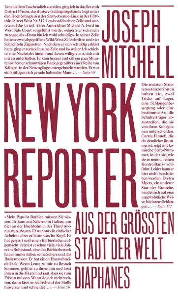 Am Tag des großen Börsenkrachs 1929 trifft Joseph Mitchell in New York ein. Er ist ganze einundzwanzig Jahre alt. Als Reporter für The Herald Tribune und The World-Telegram berichtet er bald über Sportereignisse, Mordprozesse, Unfälle, Trivialitäten – und über seine Lieblingsthemen: Randexistenzen, Spinner, Exzentriker. Ob es eine Preisboxerin ist, ein hochintelligenter Gangster oder ein Voodoo-Zauberer, die Ausläufer der italienischen Anarchistenbewegung, der Lindbergh-Prozess oder Burlesque-Clubs: Sie alle schildert Joseph Mitchell mit Enthusiasmus, Empathie, einer ordentlichen Portion Humor und großer Detailfreude. So entsteht ein vielstimmiges Panorama des New Yorker Stadtlebens aus der Zeit der Großen Depression.