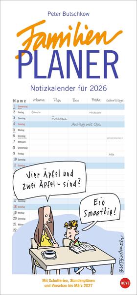 - Lachen hilft: Gut gelaunt durch den Alltag mit dem Butschkow Familienkalender 2026 - Für die tägliche Dosis Humor: Praktischer Monats-Planer mit Cartoons von Peter Butschkow über vorlaute Rotznasen, pubertäre Teenager und Eltern am Rande des Wahnsinns - Organisationshilfe für Groß und Klein: Kalender mit Schulferien, Stundenplänen und 3-Monats-Vorschau aufs Folgejahr, im kompakten 21 x 45 cm Hochformat - Das Raumwunder unter den Familienplanern: 5 Spalten Platz für wichtige Termine, Ferien- und Freizeitaktivitäten - Gemeinsam schöner Pläne schmieden: Die Familien-Wandkalender von Heye aus dem Athesia Kalenderverlag