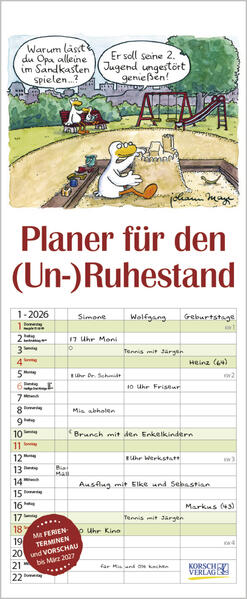 Johann Mayrs Kultkalender mit witzig-charmanten Cartoons über das turbulente Leben im (Un-)Ruhestand. Neben dem gesamten Kalenderjahr enthält der Wandplaner auch eine Vorschau März des Folgejahres.