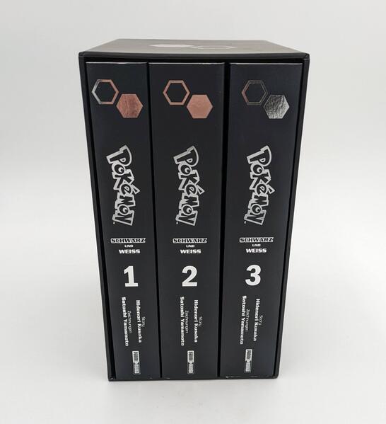 Der komplette Schwarz und Weiss Story-Arc in drei dicken Bänden im exklusiven Schuber und mit Postkarten der Original-Cover! Es beginnt! Eine neue Region, eine neue Herausforderung! Seit seiner Kindheit ist es Schwarz' größter Traum, die Top Vier und den Champ zu besiegen, um in die Ruhmeshalle der Pokémon-Liga einzuziehen. Mit diesem Ziel vor Augen bricht er zu seiner Reise durch Einall auf und bestreitet fortan zahlreiche Pokémon-Kämpfe. Inhalt ¿ der komplette Story-Arc in 3 Deluxe-Bänden (21 x 15 cm) ¿ Mit 9 Postkarten der originalen japanischen Cover-Illustrationen in einem Umschlag ¿ schwarzer Schuber (ca. 15,5 x 12,3 x 22 cm) Limitiert auf 1111 Exemplare