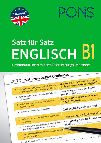 • Grammatik der Stufe B1 wird in überschaubaren Portionen erklärt, z. B. Past Simple vs. Past Continuous, Present Perfect Simple vs. Continuous, Ausdrücke mit get, Präpositionen ...