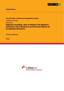 Essay from the year 2017 in the subject Business economics - Business Management, Corporate Governance, , language: English, abstract: This essay elaborates on some basic principles and investment strategies that have been proposed to reduce the effects of emotions and biases, and foster rational decision-making.In the first part of this paper, I will summarize some of Weber’s findings on how humans are influenced by emotions and biases when interpreting information and making decisions. The second part will focus on how (i) reducing trading to a minimum, (ii) diversification and (iii) aiming for the market return can help to control personal biases in investing.Investing money provides great opportunities, but also bears great risks. The market is unforeseeable no matter how much experience you have or how many books you read. Consequently, there is not the one right thing to do in order to be successful. However, there are some guidelines that can reduce your personal risk, help to control personal biases and make our decisions more rational.