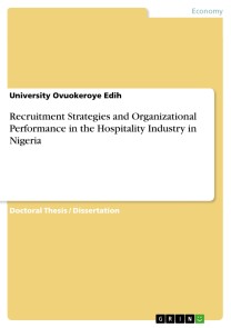 Doctoral Thesis / Dissertation from the year 2021 in the subject Business economics - Business Management, Corporate Governance, grade: B, , course: MANAGEMENT, language: English, abstract: The study examined recruitment strategies and organizational performance in the hospitality industry in Nigeria. The main objective is to examine the effect of recruitment strategies on organizational performance in the hospitality industry in Nigeria. Literatures were reviewed in the context of conceptual review, empirical review and theoretical review. The study adopted a cross- sectional survey design to sample a fair representation of the target population. It made use of both primary and secondary data. Structured questionnaire was used to generate primary and five- point Likert scale and five hypotheses were drawn for the study. Interview was also conducted to corroborate responses gathered through questionnaire. Taro Yamane’s sample size formular for finite population was adopted by the study. The five hypotheses were tested using multiple regressions analysis at 0.05 level of significance and statistical packages for social science (SPSS) version 20 was used to analyze the descriptive data. Findings showed that, job advertisement, selection interview, referral and private employment agencies had positive and significant effect on organizational performance while host community recruitment did not show significant impact on organizational performance. Reason was that hotels in Nigeria have not recruited staff through the host community recruitment window in spite of its peaceful business ideals. Results from the regression analyses showed that job advertisement had a statistical significant effect on organizational performance with (coefficient =0.406, p=0.00<0.5), employee’s referral recruitment had a significant effect on organizational performance with ( coefficient =0.473, p=0.000<0.05), employment agencies also had significant effect on organizational performance with (coefficient = 0.4735,p=0.000<0.05), Selection interview demonstrated a significant effect on organizational performance with (coefficient =0.545, p=0.000<0.05) while host community recruitment did not have significant effect on organizational performance as shown by (coefficient =0.592, p=0.051>0.05). The study concluded that recruitment strategies significantly affect organizational performance in the selected hospitality firms. [...]