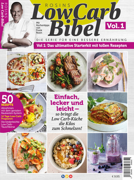Nachdem die Zeitschrift "Rosins Fettkampf" ein riesiger Erfolg war, bringt der bekannte TV-Koch mit dem bpa media Verlag nun eine ganze Magazin-Serie namens "Low Carb-Bibel" auf den Markt. Die kohlenhydratarme Ernährung begeistert die Menschen bereits seit Jahren und findet immer mehr Anhänger*innen, die bewusst auf Zucker, (Weiß-)Mehl und Co. verzichten möchten. Im ersten Teil der Serie dreht sich alles um die Grundlagen des Themas: Die besten Zutaten, Heißhungerfallen und Austauschmöglichkeiten für Zucker und Mehl sowie Tipps, wie der Ernährungsstil in den Alltag integriert werden können, werden im Heft erklärt. Sage und schreibe 50 Rezepte für jede Tageszeit sowie ein 4-Stufen-Programm sorgen dafür, dass die Umstellung vereinfacht wird und jede*r sie in seinem eigenen Tempo angehen kann. Vorratslisten und Wochenpläne helfen dabei, die Ernährung langfristig umzustellen.