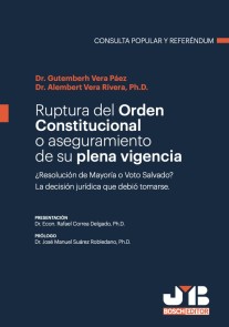"e;El objeto del estudio y del analisis esta directamente relacionado con la propuesta de reforma constitucional que mediante Referendum y Consulta Popular planteo la Funcion Ejecutiva del Estado ecuatoriano, consulta que se realizo el domingo 4 de febrero de 2018. El libro que se presenta, Ruptura del Orden Constitucional o aseguramiento de su plena vigencia, aunque se trate de un documento tecnico-juridico, la relevancia del mismo no esta solo en el ambito de los profesionales y estudiosos del Derecho, sino y principalmente, en el espacio referido a los ciudadanos. Por eso, desde el nombre del documento hemos querido presentarlo como una propuesta de discusion ciudadana elaborada por juristas, por estudiosos del derecho, pero que ante todo son ciudadanos ecuatorianos. Se presenta en la forma de Dictamen, es decir, guardando la forma y mecanismos en la que pudo la defenestrada y que podria la nueva Corte Constitucional resolver la solicitud de Dictamen como requisito de constitucionalidad previo a la tramitacion de una reforma Constitucional por cualquier via, en el presente caso, a traves de Referendum y Consulta Popular. Ademas, podria servir de argumento juridico-constitucional, para el Control Posterior de Constitucionalidad que la Corte debe realizar en el marco de sus funciones. Como afirma el Dr. Econ. Rafael Correa Delgado, Ph.D., "e;Los grandes ausentes en el descalabro sufrido por el pas fueron la Academia y los profesionales del Derecho. Si estos ltimos aparecieron, fue de forma totalmente politizada para justificar lo injustificable, tan solo por el odio a una opcin poltica que cambi histricamente y para bien la vida de los ecuatorianos. Si la verdad y el Derecho se tuercen en funcin de intereses, por legtimos que estos se consideren, no solo la democracia y el Estado de Derecho estn en peligro, sino la propia civilizacin. Con el libro "e;Ruptura del Orden Constitucional o aseguramiento de su plena vigencia Resolucin de Mayora o Voto Salvado? La decisin jurdica que debi tomarse"e;, Alembert y Gutemberg Vera intentan enderezar las cosas, para que la historia tenga registro de lo que reamente pas, y para que un da, ms temprano que tarde, este material sirva para recuperar el futuro por parte de todos aquellos que verdaderamente "e;a travs del Derecho buscan justicia"e;"e;."e;