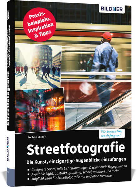 Street ist die Art der Dokumentarfotografie, bei der "König Zufall" regiert und wenig Zeit für Einstellungen bleibt. Doch was unterscheidet gute Streetaufnahmen von Schnappschüssen? Wie fängt man eine flüchtige Situation sowie Stimmungen wirkungsvoll ein? Was ist rechtlich erlaubt? Mithilfe ausgesuchter Beispielbilder stellt Ihnen Jochen Müller die Techniken vor, auf die es ankommt, und gibt  Ihnen neben seinem Wissen viele praktische Tipps an die Hand. Mit oder ohne Menschen, farbig oder schwarz-weiß, Bewegung zeigend oder einfrierend, durchgehend scharf oder mit Unschärfe, abstrakt oder dokumentarisch: Begleiten Sie den Autor auf seinem Streifzug und lernen Sie die Vielseitigkeit der Streetfotografie kennen und beherrschen!
