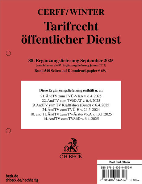 Die 88. Ergänzungslieferung enthält u.a. Änderungen durch die 10. und 11. ÄndTV zum TV-Ärzte/VKA, den 21. ÄndTV zum TVÜ-VKA und den 22. ÄndTV zum TVöD AT sowie den 24. ÄndTV zum TVÜ-H.